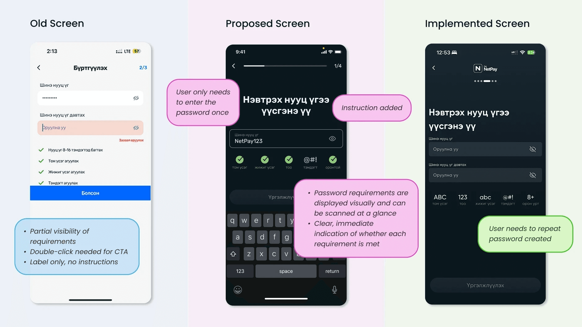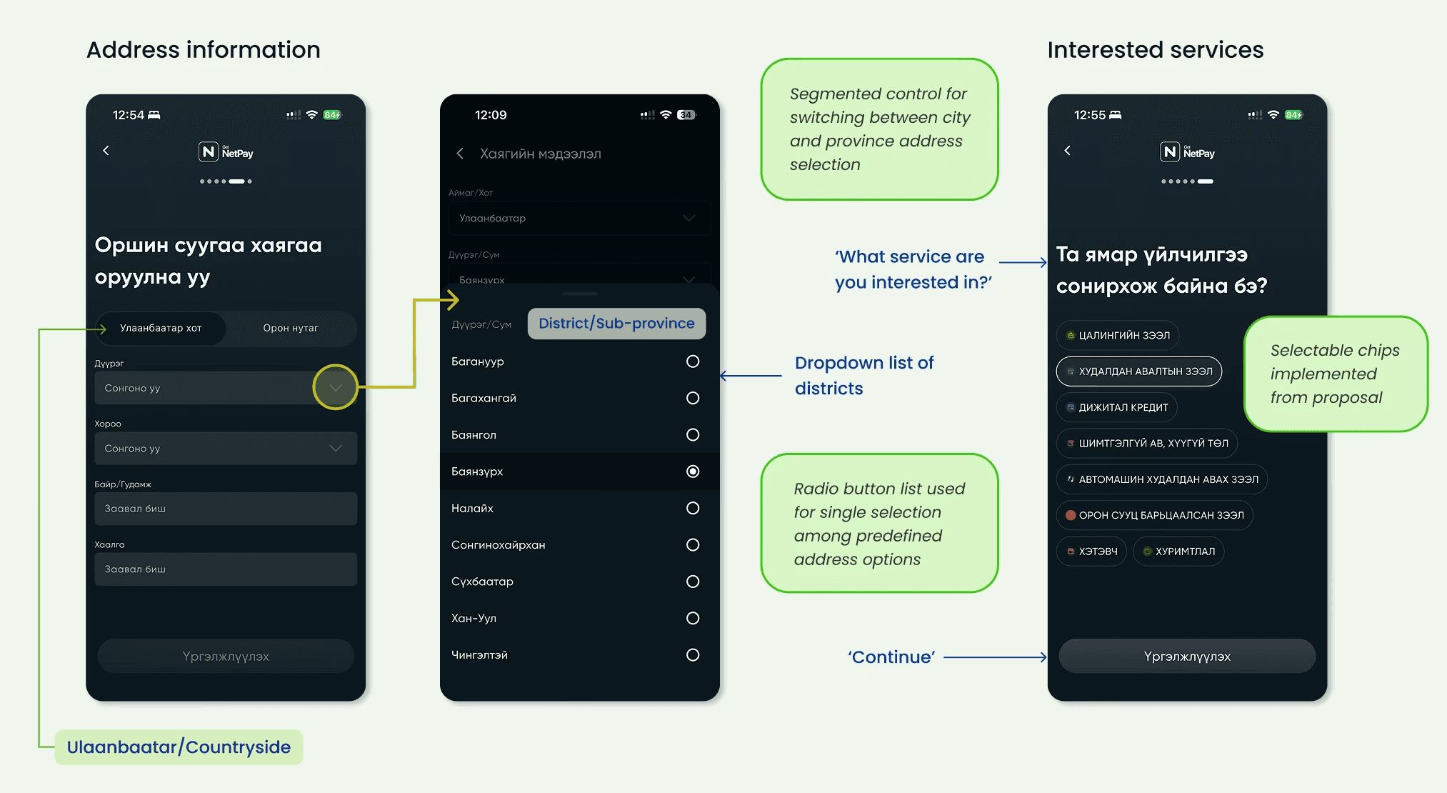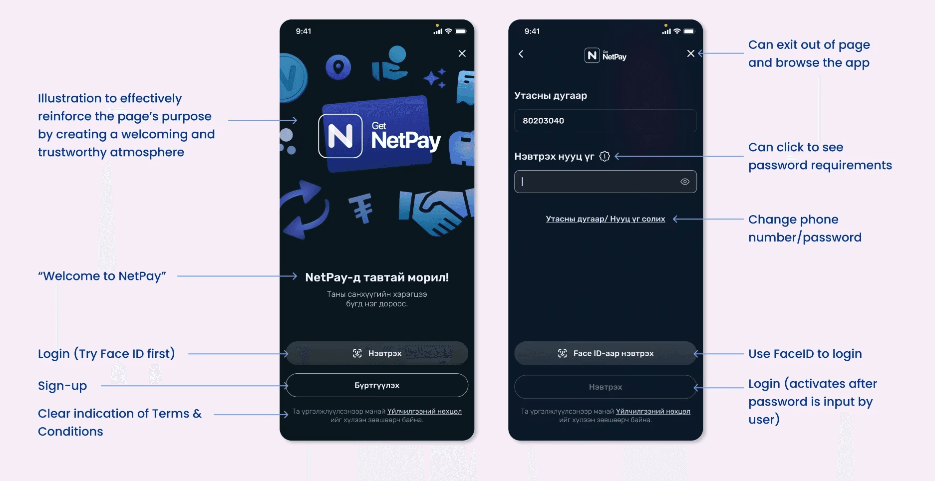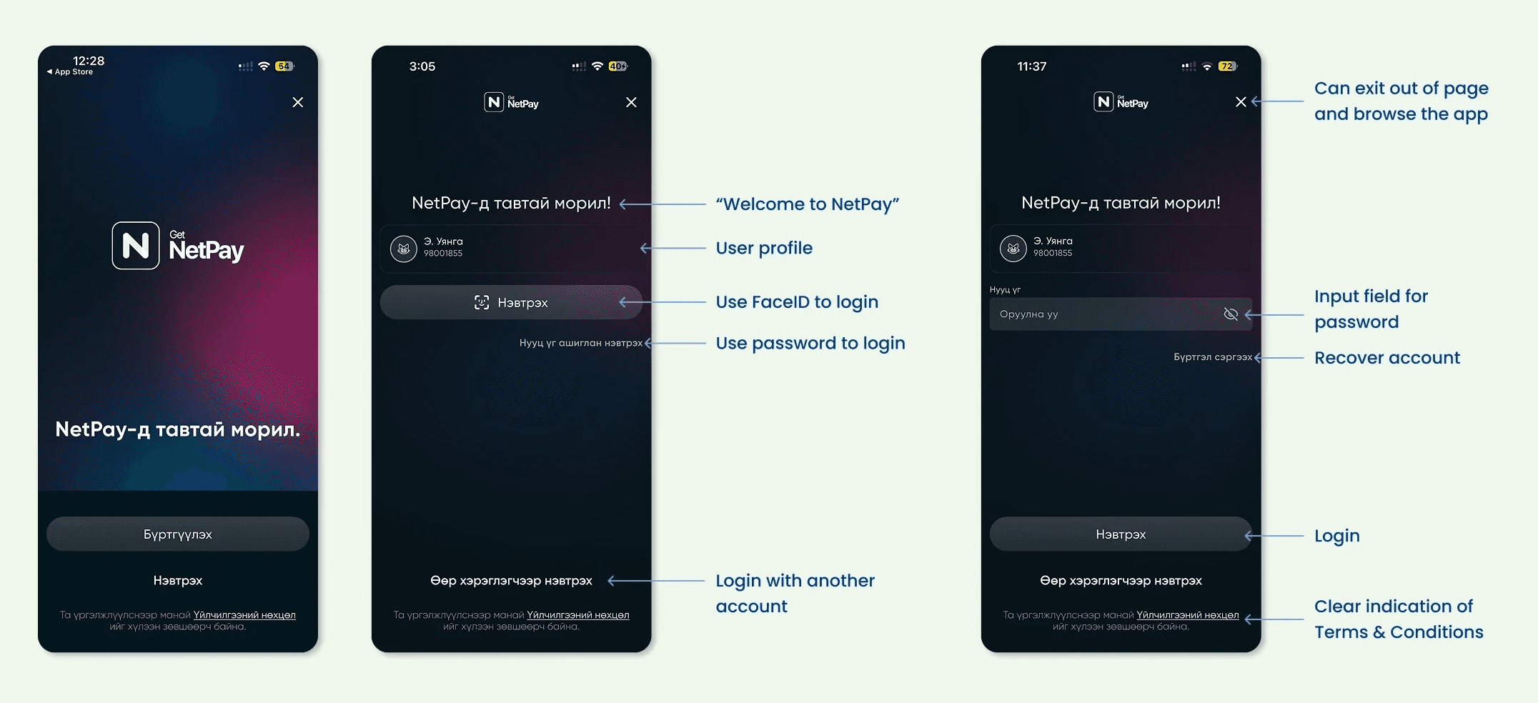 Note: NetPay by NetCapital is currently available only in Mongolia; screenshots and an annotated prototype are provided below.